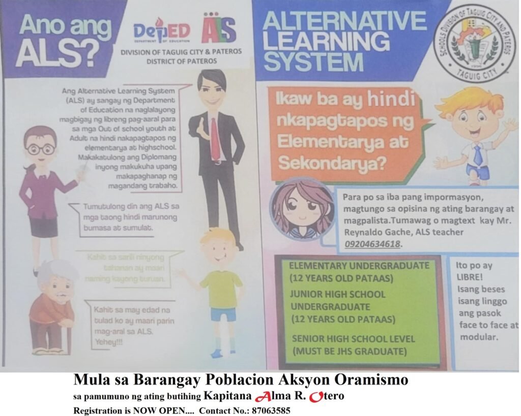 Alternative Learning System Registration is now OPEN! WHOEVER WOULD LIKE TO REGISTER AS ALS, JUST GO TO OUR BARANGAY HALL. COME & JOIN!